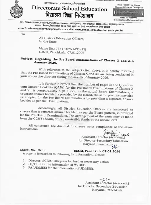 इन परीक्षाओं में प्रयोग होने वाली प्रश्न–उत्तर पुस्तिकाओं के पन्नों की संख्या अपेक्षाकृत अधिक है… जबकि वास्तविक बोर्ड परीक्षाओं में बोर्ड द्वारा प्रश्न पत्र और अलग उत्तर पुस्तिका उपलब्ध कराई जाती है…. इसी को ध्यान में रखते हुए शिक्षा विभाग ने निर्देश दिए हैं कि प्री-बोर्ड परीक्षाओं में भी बोर्ड परीक्षा के पैटर्न के अनुसार अलग से उत्तर पुस्तिका उपलब्ध कराई जाए… इससे विद्यार्थियों को बोर्ड परीक्षा जैसी परिस्थितियों का अभ्यास मिलेगा और वे परीक्षा के दौरान उत्तर लिखने की बेहतर तैयारी कर सकेंगे…